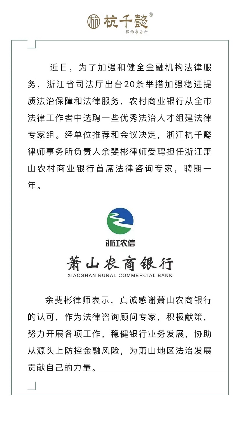 杭千懿喜讯|本所负责人余斐彬律师受聘担任浙江萧山农村商业银行首席法律咨询专家
